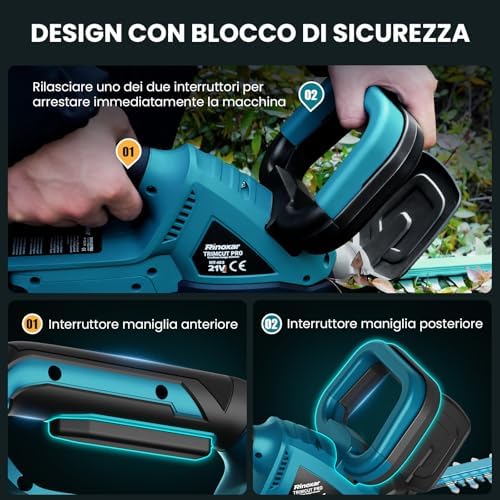 Il sistema a doppio interruttore garantisce l’arresto immediato del tagliasiepi per un utilizzo sicuro e controllato in ogni momento.