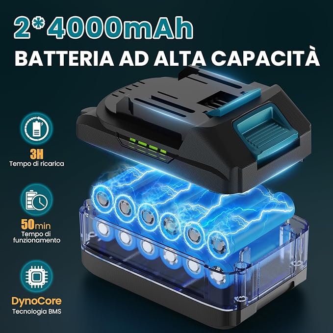 Le due batterie incluse durano a lungo, permettendomi di completare il lavoro senza interruzioni. Un grande vantaggio rispetto ad altri modelli.